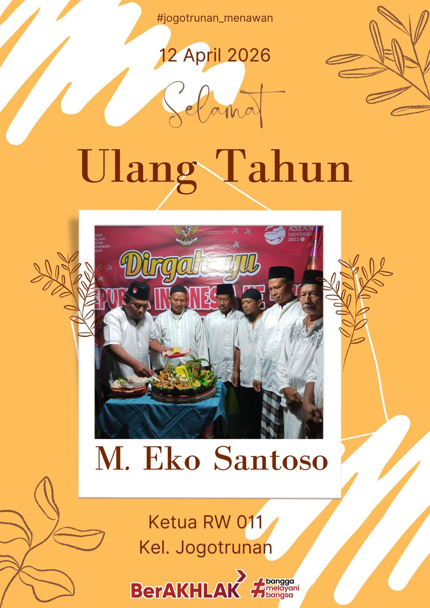 ULANG TAHUN PENGURUS LINGKUNGAN DI KELURAHAN JOGOTRUNAN (12/04/2026) Hari Ini, Pengurus Lingkungan di Kelurahan Jogotrunan, yang sedang memperingati hari Kelahirannya adalah Ketua RW 011 ...