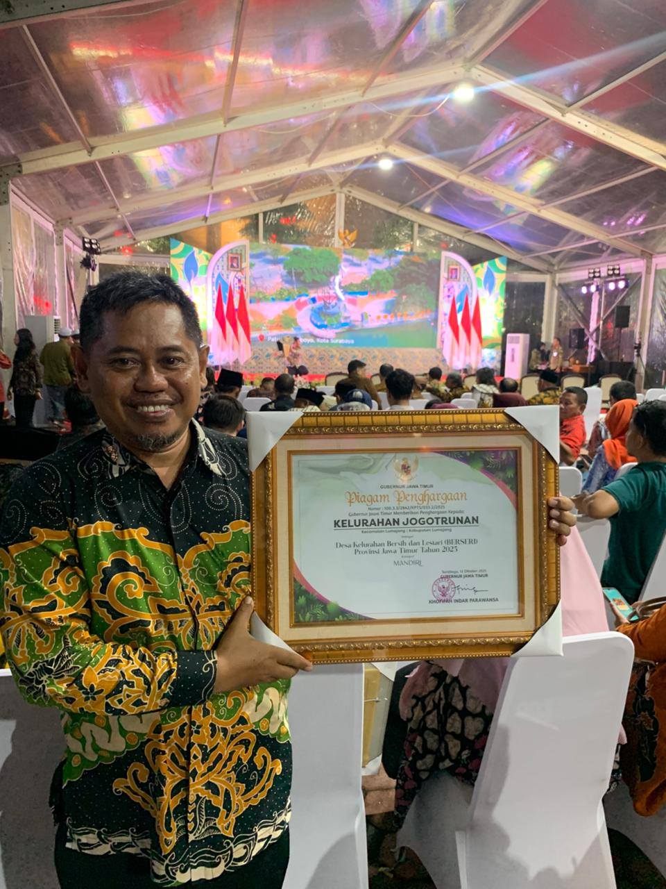 LURAH JOGOTRUNAN MENERIMA PENGHARGAAN KELURAHAN BERSERI KATEGORI MANDIRI Upaya Pelestarian Lingkungan Hidup pada Lingkungan 18 RW di Kelurahan Jogotrunan terasa semakin berkembang dalam 1 ...